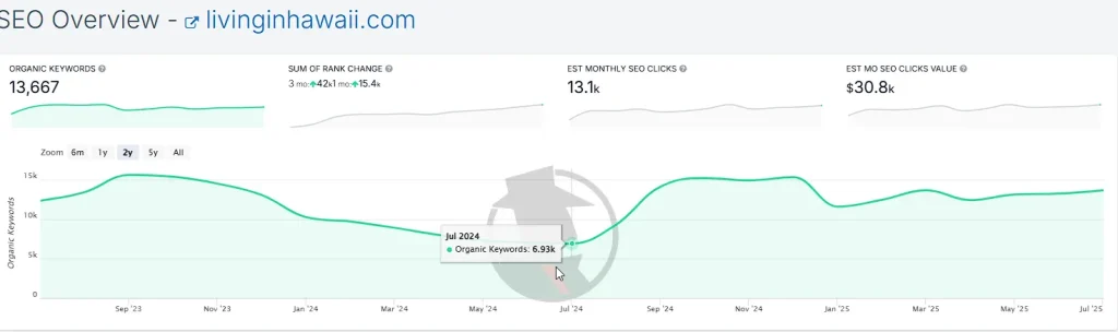 Living In Hawaii’s success in a market filled with well-funded real estate firms demonstrates what’s possible when strategic SEO expertise meets authentic local knowledge. While realtors continue to invest heavily in paid campaigns, we’ve proven that smart, systematic SEO can help you compete effectively. The site continues to grow, with projections showing potential for 30,000+ keywords within the next year.